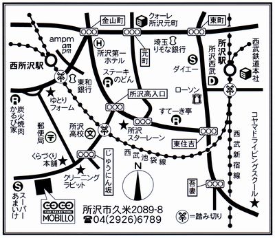 | 徒歩の場合、西武池袋線「西所沢」駅から約12分です。 車の場合は、西所沢駅周辺は一方通行があって道が複雑なので、 「所沢高入口」「じゅうにん坂」交差点を経由してお越し下さい。 両隣に垣根や建物があってわかりにくいかもしれませんが、 蛍光塗料のロゴが目にもまぶしいダークブルーの看板と、 正面にドーンと立った電信柱が目印です。 |